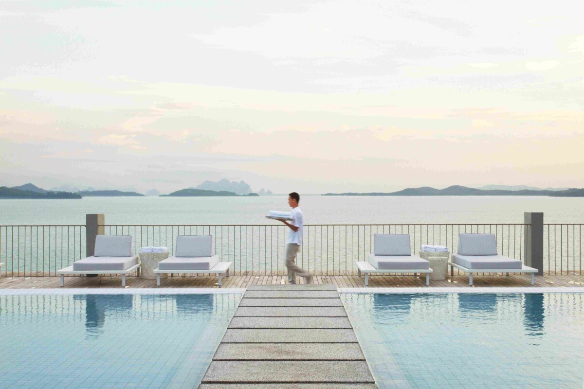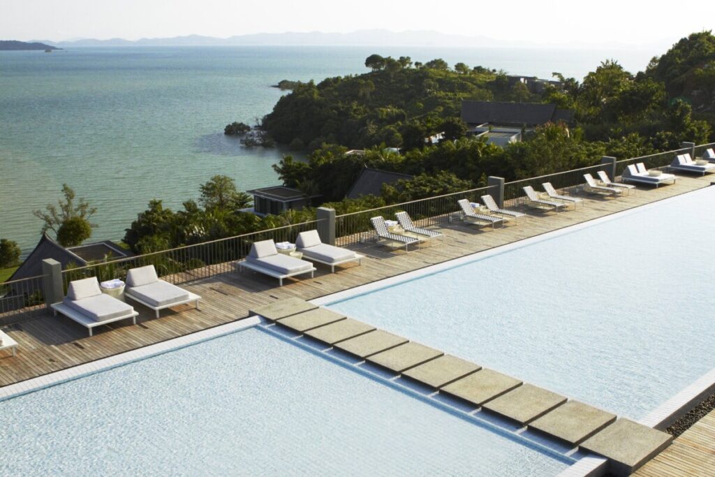 Designed by Italian visionary Paola Navone, this pool is instantly recognizable by its vivid turquoise tiles which perfectly match the color of the Andaman Sea. The pool sits on the tip of the Cape Yamu peninsula, offering panoramic views of the dramatic limestone karsts of Phang Nga Bay. It is a vibrant, contemporary classic that celebrates the colors of Thailand.