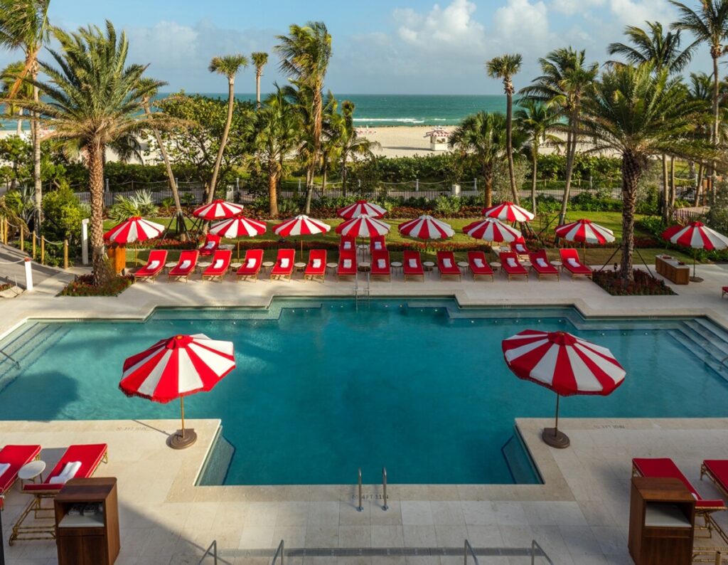 The Faena brings the golden age of Miami glamour back to life with a surreal twist. The pool area is legendary not just for its red and white Art Deco umbrellas, but for the massive sculpture that sits centrally in a glass case: Damien Hirst’s “Gone but not Forgotten”—a 24-karat gold woolly mammoth skeleton. It is eccentric, bold, and undeniably iconic.