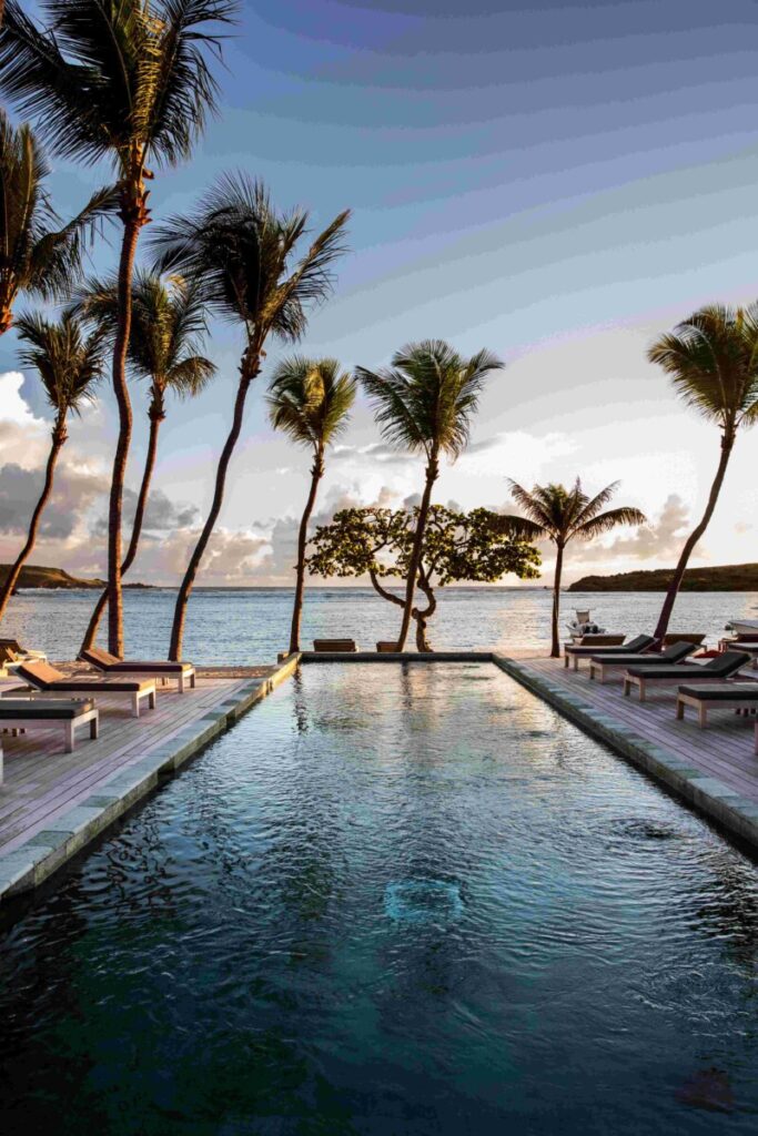 Located on the pristine Grand Cul-de-Sac, this pool is the heart of the hotel designed by the legendary Christian Liaigre. It is low-profile, sleek, and framed by swaying palms, extending toward the turquoise lagoon. The pool’s shallow, calm nature makes it perfect for wading with a cocktail in hand, embodying the effortless, stylish relaxation that St. Barth is famous for.