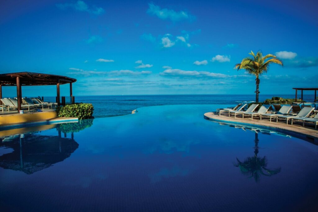 The “Nuna” pool at the Four Seasons Punta Mita is a free-form infinity pool that blends indistinguishably with the Pacific Ocean. The design focuses on unobstructed views of the horizon, making it a prime location for whale watching during the season or viewing the flaming red sunsets of the Riviera Nayarit. It captures the relaxed, sun-drenched spirit of Mexico’s Pacific coast.