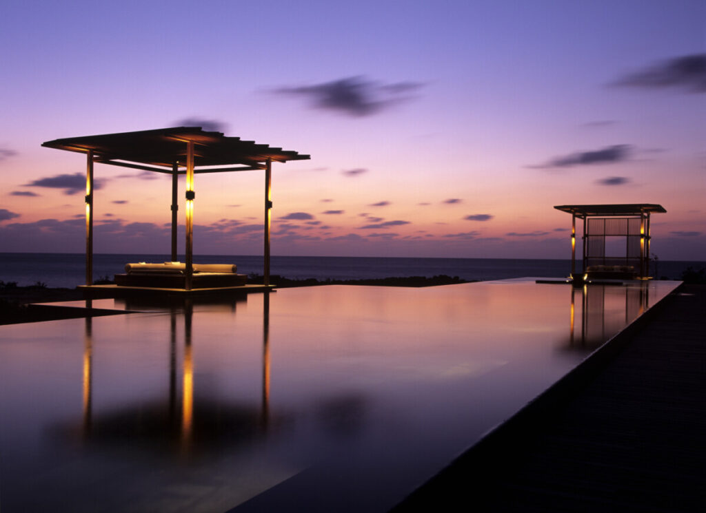 Amanyara is celebrated for its peace and precision. The main swimming pool is a dark, volcanic rock rectangle that acts as a mirror for the changing sky. Surrounded by timber pavilions and lush vegetation, the pool emphasizes silence and reflection. It is less about splashing and more about the meditative beauty of water meeting architecture.