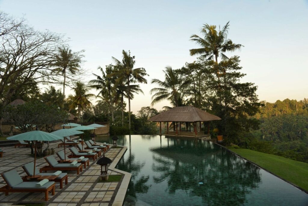Designed to mimic the shape of the surrounding rice paddies, the pool at Amandari is a masterclass in harmonizing with nature. Perched on the lip of the Ayung River gorge, the pool is lined with emerald-green tiles that reflect the lush jungle canopy. As dusk falls, traditional gamelan music often drifts across the water, creating a spiritual atmosphere that is quintessentially Balinese.